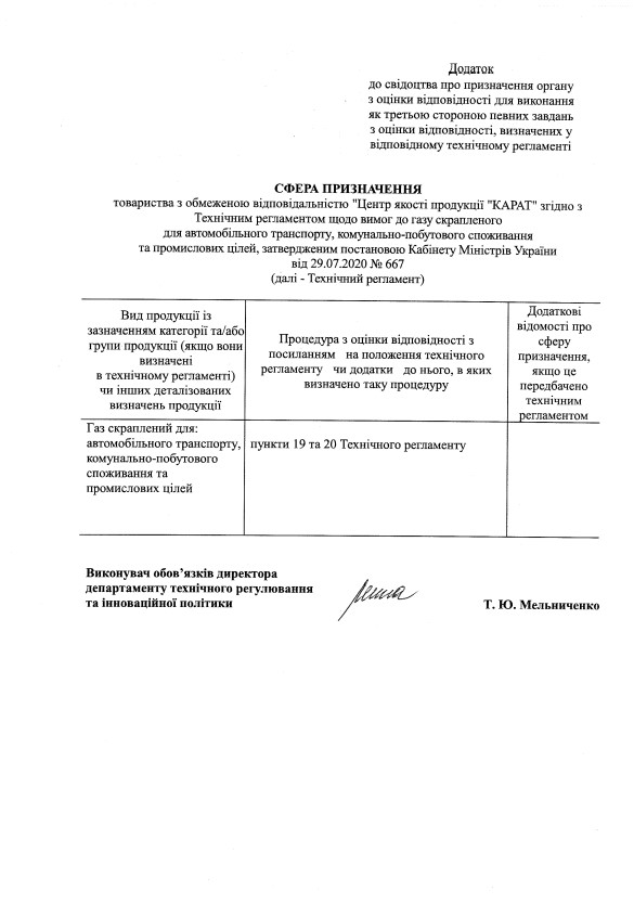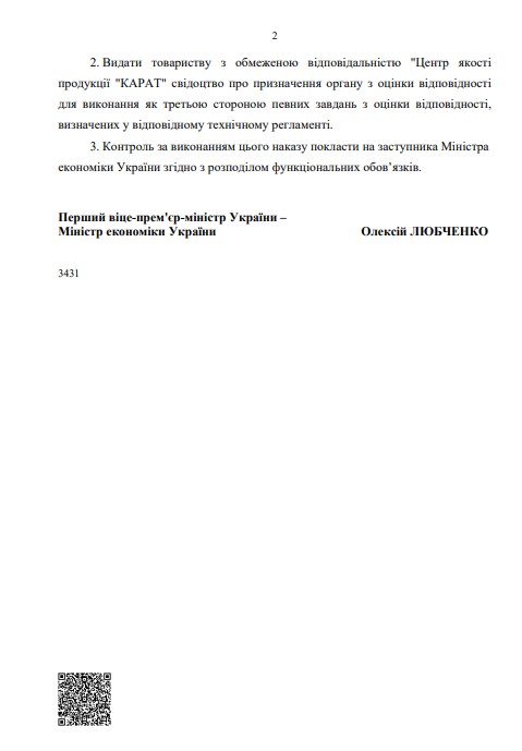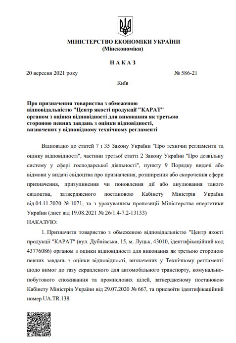 «Назначить общество с ограниченной ответственностью «Центр качества продукции «КАРАТ» (ул. Дубновская, 15 м. Луцьк, 43010, идентификационный код 43776086) органом по оценке соответствия для выполнения как третьей стороной определенных задач по оценке соответствия, определенных в Техническом регламенте о требованиях к сжиженному газу для автомобильного транспорта, коммунально-бытового потребления и промышленных целей, утвержденном постановлением Кабинета Министров Украины от 29.07.2020 No 667», - говорится в приказе за подписью первого вице-премьер-министра Украины – Министра экономики Украины Алексея Любченко.