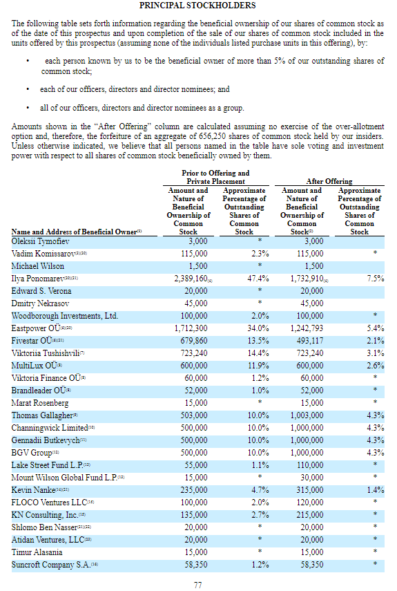 В частности, опубликованы 30 компаний и частных лиц, а также информация об происхождении акций. Ключевым акционером компании является бывший депутат Государственной Думы России Илья Пономарев. Кроме него, в составе акционеров целая плеяда выходцев из России и стран СНГ: Вадим Комиссаров, Дмитрий Некрасов, Марат Розенберг, Тимур Аслания (дядя Михаила Саакашвили), Виктория Тушишвили и ее муж Эдуард Хидиров (депутат из Дагестана имевший проблемы с законом за банковские махинации), Патима Ахмедова и многие другие. Председатель совета Trident Acquisitions американец Эдвард Верона тесно связан с Россией, в частности в 2008-2013 гг. был президентом US-Russia Business Council.