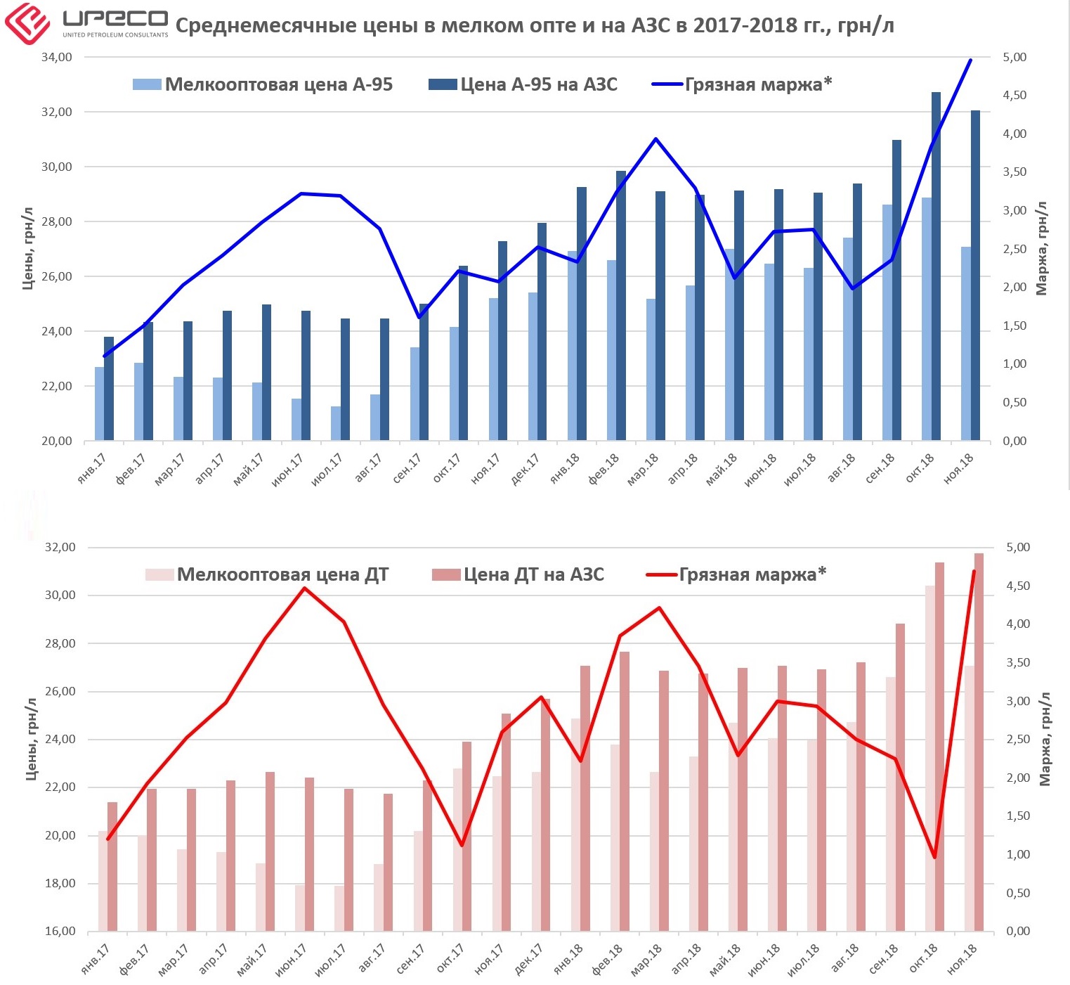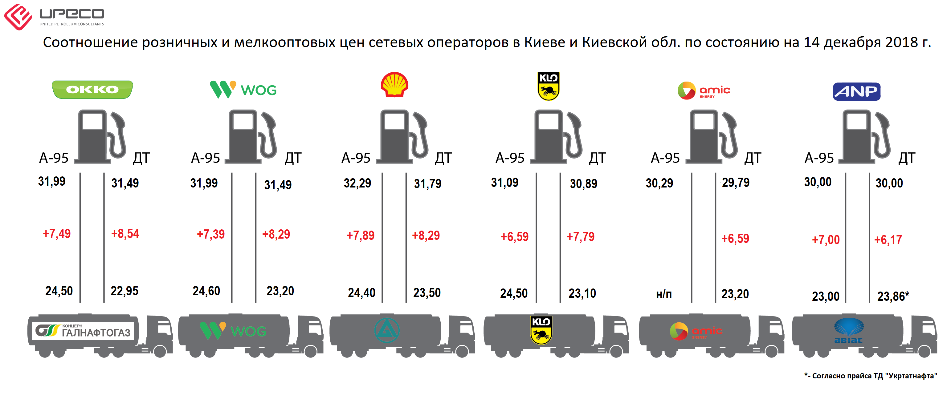 По состоянию на 14 декабря 2018 года по данным консалтинговой компании UPECO разница между мелкооптовыми и розничными ценами на топливо в Киеве и Киевской области у ключевых операторов рынка достигла максимальных значений в гривне за 2 года: на бензин А-95 6,59-7,89 грн/л (26,9-32,3%), на дизельное топливо – 6,14-8,54 грн/л (25,7-37,2 % ).