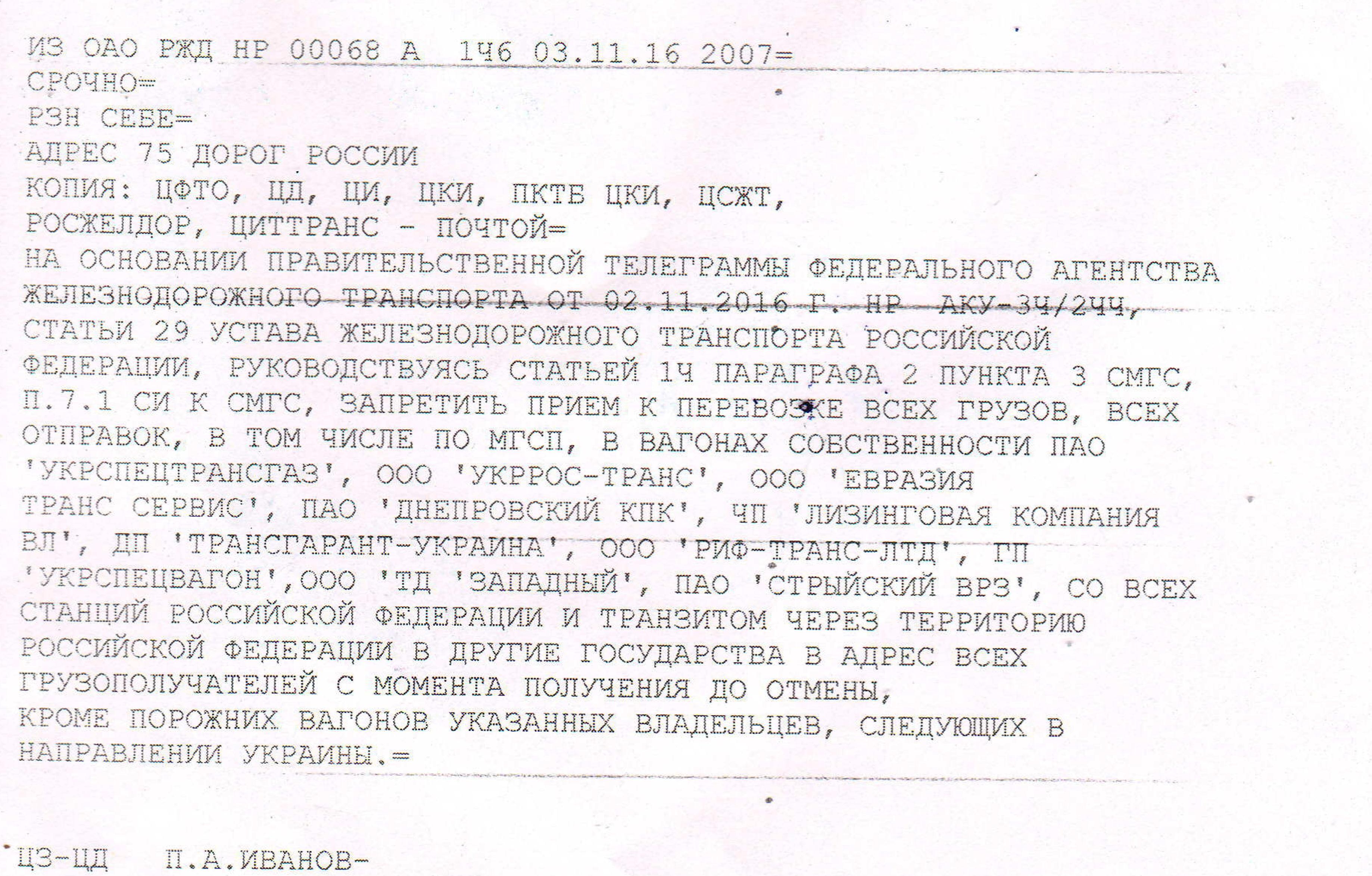 «Запретить прием к перевозке всех грузов, всех отправок в том числе по МСГП, в вагонах собственности ПАО «Укрспецтрансгаз», ООО «Укррос-Транс», ООО «Евразия Транс Сервис», ПАО «Днепровский КПК», ЧП «Лизинговя компания ВЛ», ДП «Трансгарат- Украина», ООО «Риф-Транс-ЛТД», ГП «Укрспецвагон», ООО «ТД «Западный», ПАО «Стрыйский ВРЗ», со всех станций Российской Федерации и транзитом через территорию Российской Федерации в другие государства, в адрес всех грузополучателей с момента получения и до отмены, кроме порожних вагонов указанных владельцев, следующих в направлении Украины», - говорится в телеграмме.