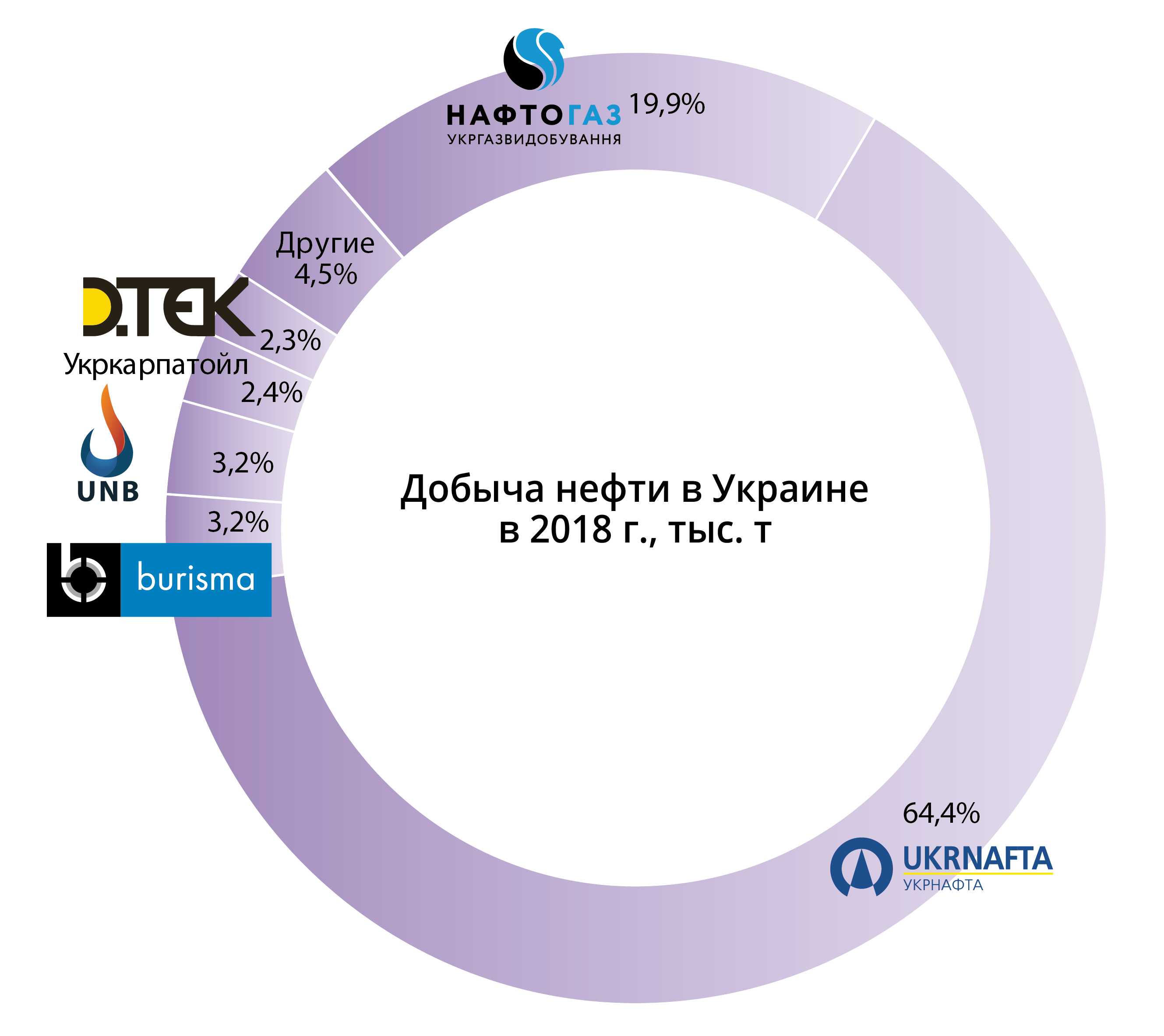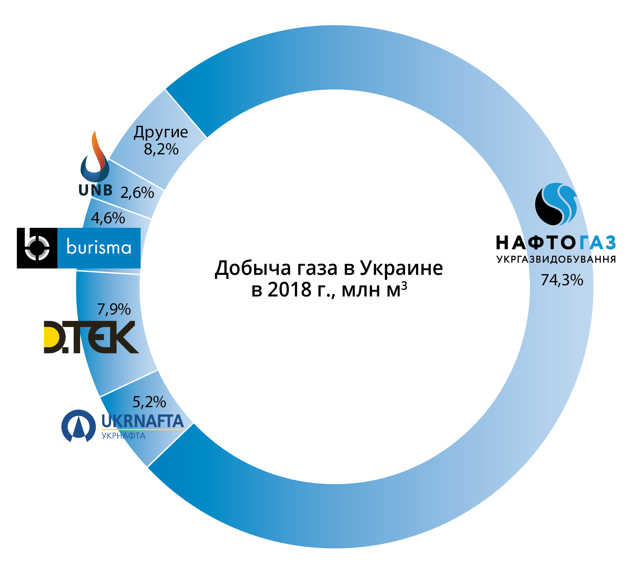 Наибольший прирост прошлого года показала компания «Укрнефтебурение», которая добыла 533 млн м3, что на 37% больше, чем в 2017. Добыча нефти и конденсата выросла на 69% до 72 тыс. т. За прошлый год было пробурено 4 новые скважины, а также проведения КРС существующего фонда. На 2019 г. планируется ввод в эксплуатацию 5 новых скважин.
