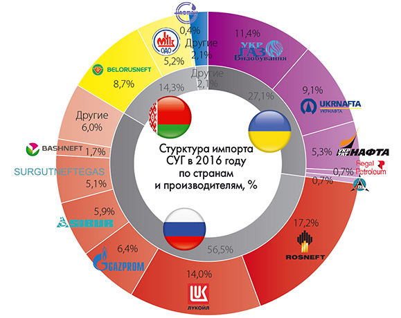 В список белорусских поставщиков следует добавить и Новополоцкий НПЗ, который в 2016 году отгрузил в Украину более 5,7 тыс. т продукта, преимущественно ШФЛУ. В итоге из-за сокращения отгрузок и роста поставок из России в общем балансе рынка СУГ Украины доля белорусских производителей снизилась с 21 до 14,3%.