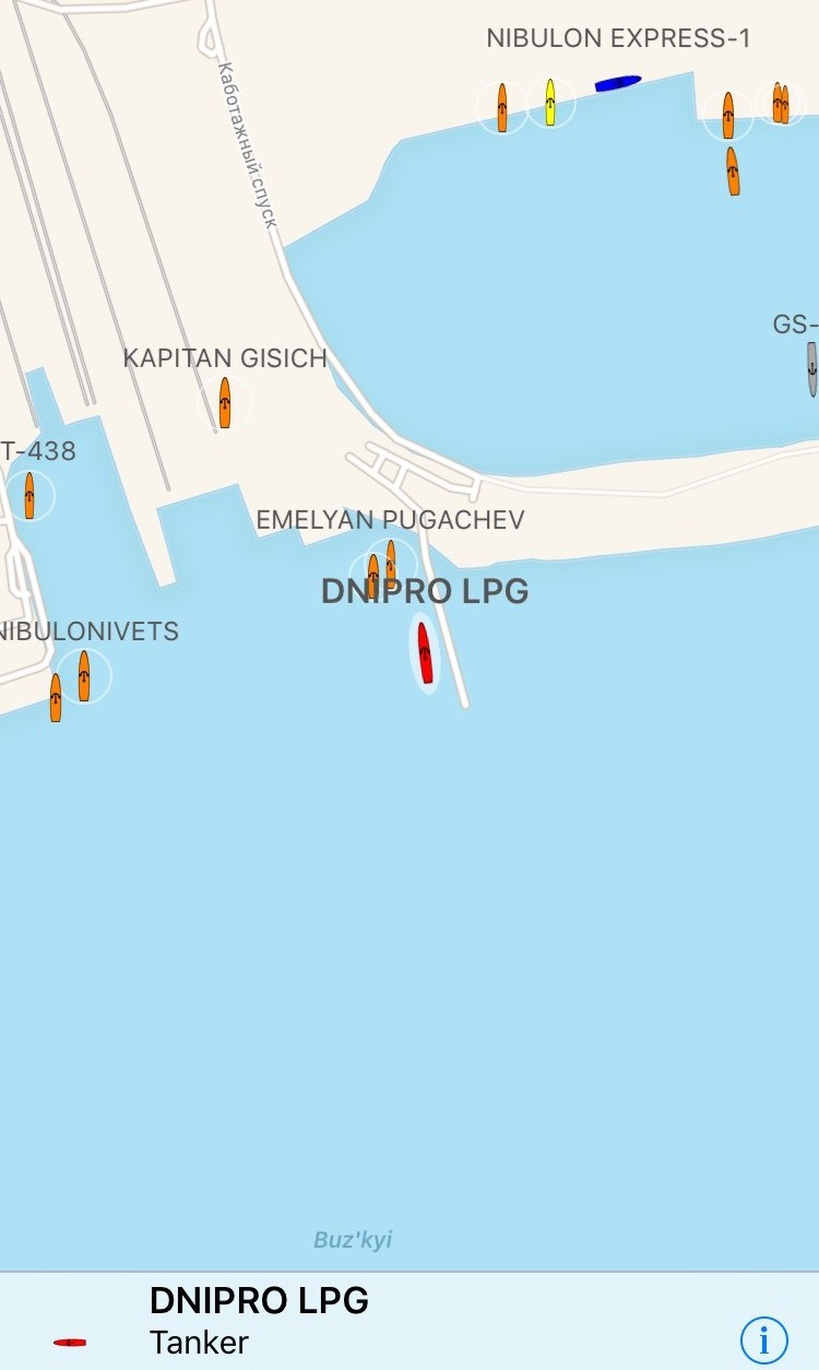 Інший танкер - Dnipro LPG (колишній Blue Stream, обсяг 1 тис. т) під українським прапором зараз знаходиться в порту Миколаєва біля причалу між «Нібулоном» і «Чорноморським судоремонтним заводом». Згідно з інформацією навігаційних служб, судно стояло на ремонті в Ізмаїлі і не заходило під завантаження в інші порти. Однак за даними учасників ринку Dnipro також може бути завантажений скрапленим газом, який можна було отримати з іншого судна в море. Інформація про митне оформлення (базис, вартість, походження і обсяг) поки відсутні.