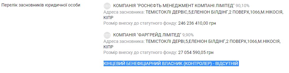 Відзначимо, як і раніше в списках засновників та власників основного пакета акцій копаннії числяться кіпрські офшори «Роснєфті» (кінцевий бенефіціар (контролер) - відсутній):