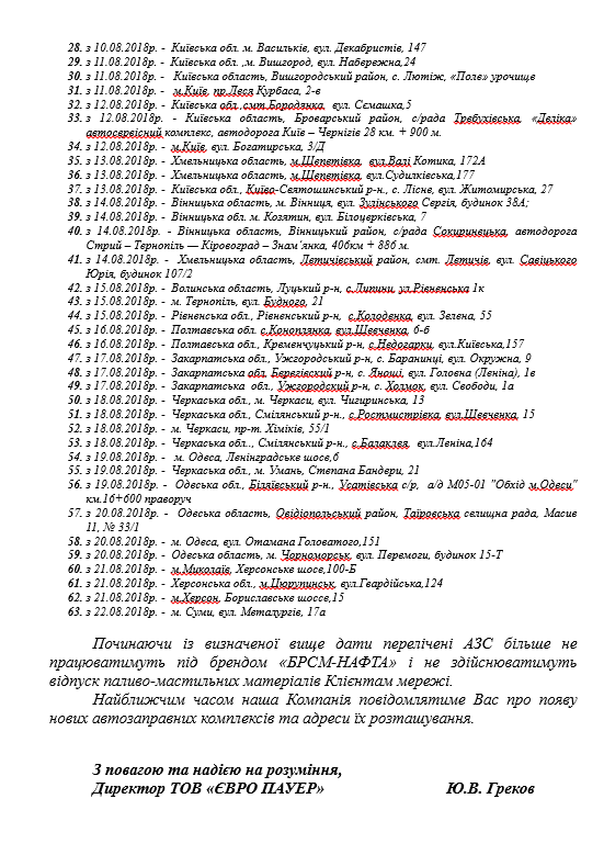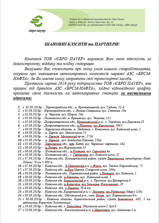 Вчора ряд компаній клієнтів «Євро Пауер» отримали повідомлення про припинення роботи роздрібних об'єктів під брендом «БРСМ-Нафта». Згідно з листом, графік зупинки станцій відбудеться протягом трьох тижнів - з 1 по 22 серпня 2018 року.