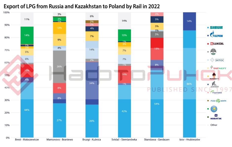 So, in 2022, railway deliveries of LPG from Russia to Poland increased by more than 20% and exceeded 1.2 million tons (together with deliveries from Kazakhstan, 1.31 million tons arrived by rail from the Russian Federation). SIBUR works are the biggest supplier of gas from Russia - 473,000 tons, of which 200,000 tons went to the gas hub - the Belarusian-Polish Brest – Małaczewicze railway crossing. A group of factories whose parent company is Gazprom is the second one in terms of volumes - up to 160,000 tons. The lion's share of Gazprom's gas crossed the border through the Belarusian-Polish Brest - Kuznica crossing - 104,000 tons. The third step is shared by Lukoil - 107 thousand tons, and a private oil company from Siberia called "Irkutsk NK" - up to 106 thousand tons.