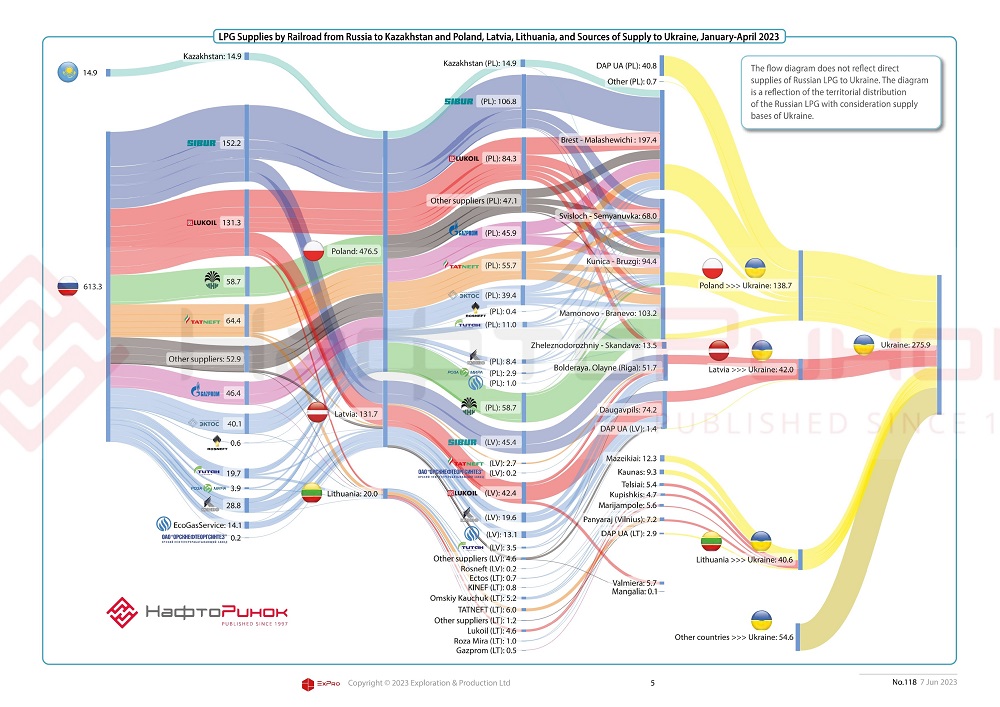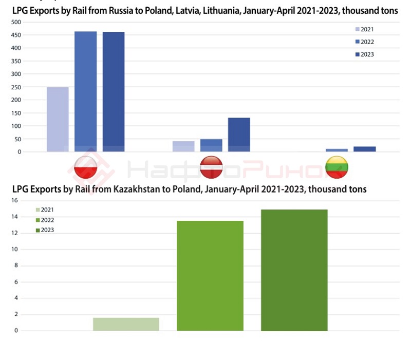 During January-April 2023, three largest exporters of liquefied gas to Ukraine – Poland, Latvia and Lithuania – received 613,000 tons of rail consignments of LPG from Russia, another 15,000 tons of Kazakh LPG were imported by rail to Poland.
