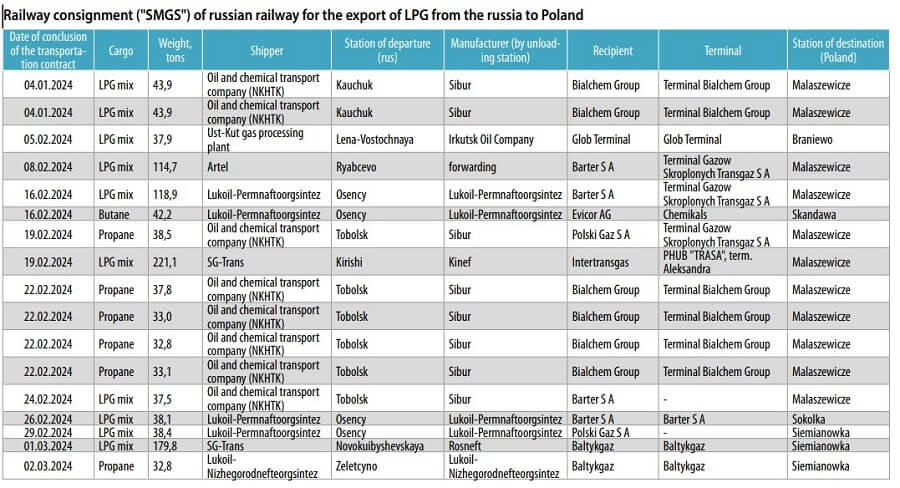 It was established that the operator of the LPG terminal in the city of Sokulka – Barter S A (Po land) – the largest supplier of LPG from Poland to Ukraine, received at least 0.3 thousand tons of railway consignments of liquefied gas produced by the Lukoil and Sibur plants. The Bialchem Group terminal received over 0.2 thousand tons of resources from the Sibur and Uralorgsintez plants. Baltykgaz received over 0.2 thousand tons of gas shipped mainly from the Novokuibyshevska station (Rosneft Refinery’s gas shipment station). At the beginning of February 2024, a tank of liquefied gas mix was shipped from the Ust-Kut gas processing plant (Irkutskoil) to the Glob Terminal in Branevo. The Polish Intertransgaz received 0.2 thousand tons of LPG produced by the Kirishinaftaorgsintez plant (Kinef) with transshipment at the PHUB "TRASA" terminal, Aleksandra terminal. Besides, the Perm Oil Refinery (Lukoil) resources were addressed to the Evicor AG trader (Switzerland). The Polish Polski Gaz S A transshipped a railway consignment from Tobolsk at the Transgaz S A terminal in Malaszewicze and received a tank of the resource from the Perm Refinery at Siemianowka station.