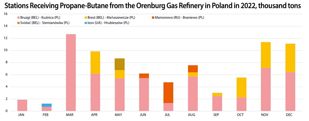 The Brest- Małaszewicze crossing is the second main station for the supply of the Orenburg gas refinery resource to Poland – 21.1 thousand tons in 2022. During June-December 2022, Romanian resident VIXON GAS SRL exported 12,000 tons of liquefied gas from Poland to Ukraine through the Małaszewicze station. According to market players, this resource also arrived in Ukraine with the indication of the country of origin – the Republic of Kazakhstan.