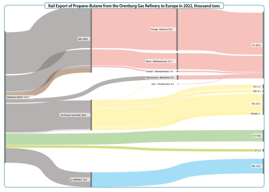 According to the data provided by logistics companies, 83.9 thousand tons of LPG were shipped from the shipment station of the Orenburg Gazprom Pererabotka (station of Kargala) for export to Poland in 2022. 78.1 thousand tons entered Poland in transit through Belarus. Of them, the railway crossing (Belarus) – Kuznica (Poland) turned out to be the largest entry site thereof into the country – 57.7 thousand tons. Besides, 21.1 thousand tons entered through the Brest-Małaszewicze crossing. Another 5.3 thousand tons crossed the Polish border from the Kaliningrad region of the Russian Federation.