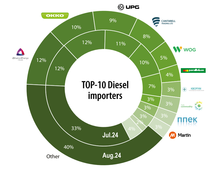 "Alliance Energo Trade" remained the top importer in August, showing the largest volume increase among the top ten suppliers with a 22% rise compared to July. This marks the second month in a row that the company has led in import growth. "Alliance Energo Trade" accounted for 12% of the total diesel imports in August.