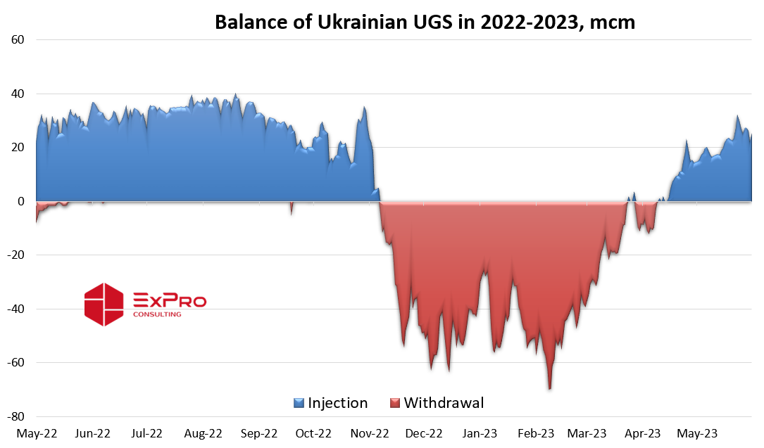 During May 2023, Ukraine injected more than 670 mcm of natural gas into underground gas storage facilities, according to ExPro calculations.