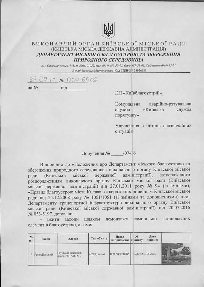 Доверенность №064-6902 на демонтаж от Департамента городского благоустройства и сохранения природной среды КГГА датирована 22 июля 2016 года.