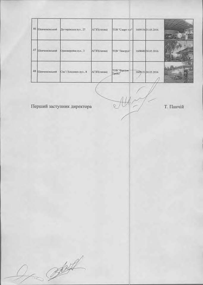 Документ подписан первым заместителем директора управления Департамента контроля за благоустройством Панчием Тарасом Михайловичем и содержит 48 объектов по розничной реализации сжиженного газа.