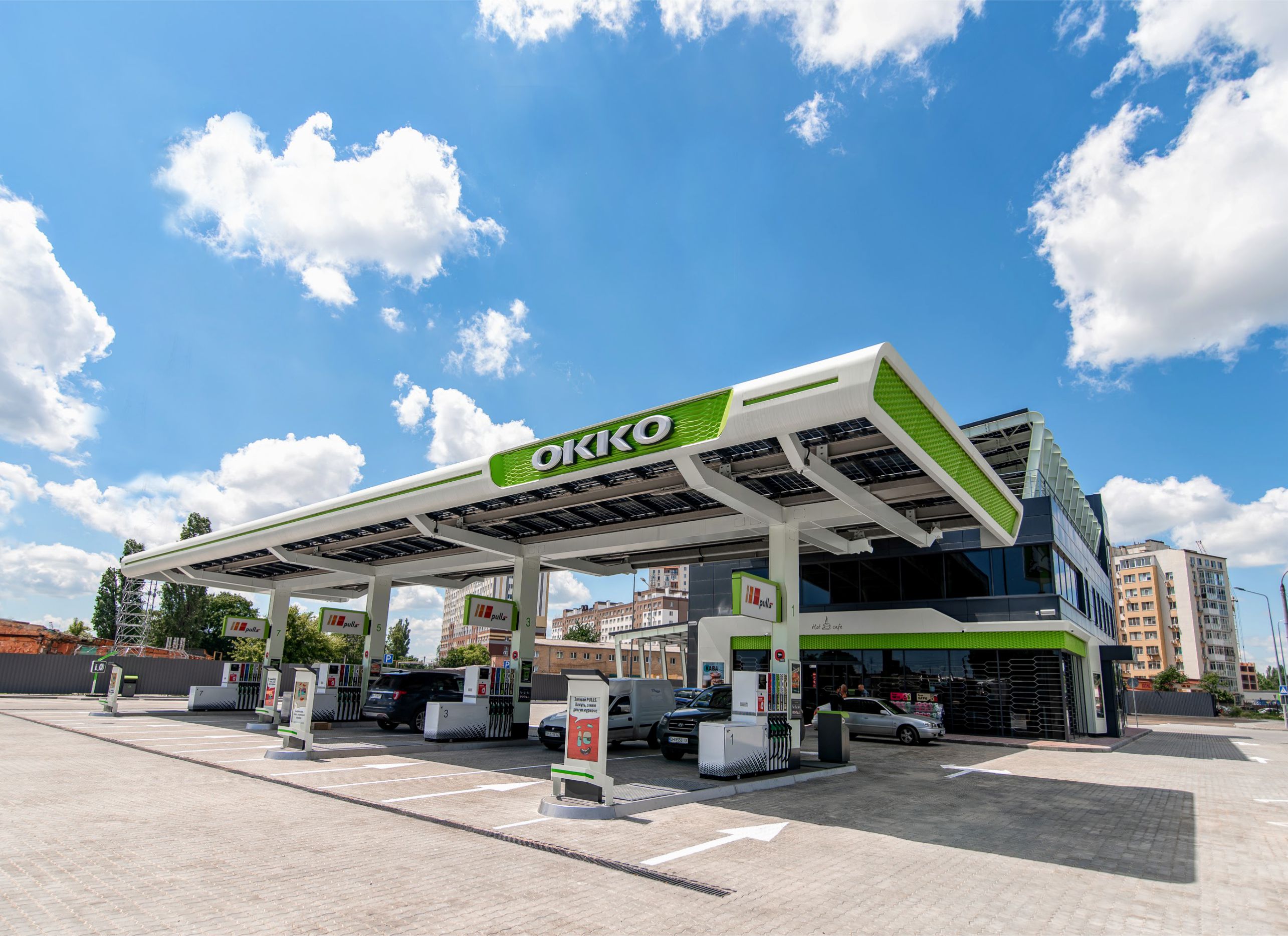 Сеть АЗК ОККО открыла в Одессе, по адресу – ул. Пестеля, 2А, новый автозаправочный комплекс, чья архитектурно-инженерная конструкция не имеет аналогов в Украине. Роль покрытия над операторной, летней террасой, навесом над зоной топливно-раздаточных колонок и переходным навесом играют солнечные панели. Ожидается, что благодаря такому решению АЗК будет покрывать до 70% своих потребностей в электроэнергии за счет собственной генерации, а в наиболее солнечные месяцы даже сможет обеспечивать себя электроэнергией полностью. Об этом сообщили в компании.