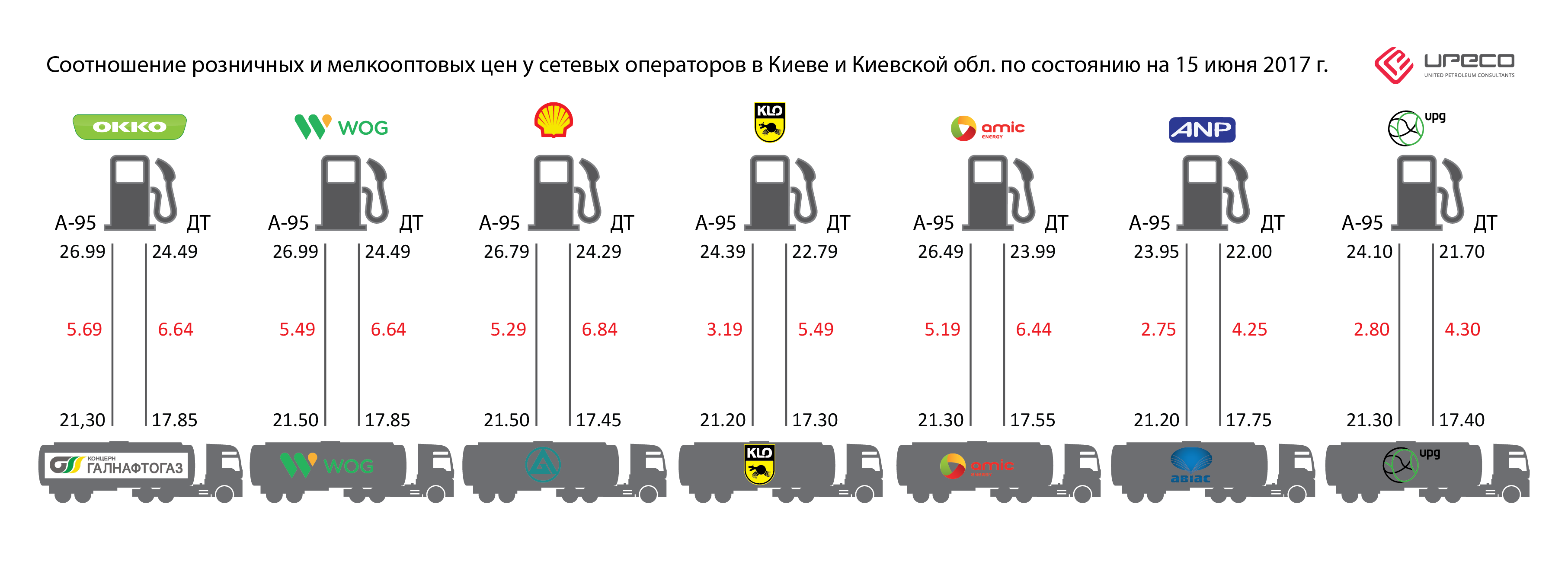 По данным консалтинговой компании UPECO, по состоянию на 15 июня 2017 года, разница между мелкооптовыми и розничными ценами на бензин А-95 в Киеве и Киевской области у главных операторов топливного рынка достигает 13,0- 26,7% (2,75 - 5,69 грн/л), на дизельное топливо – 23,9 - 39,2% (4,20 - 6,64 грн/л).