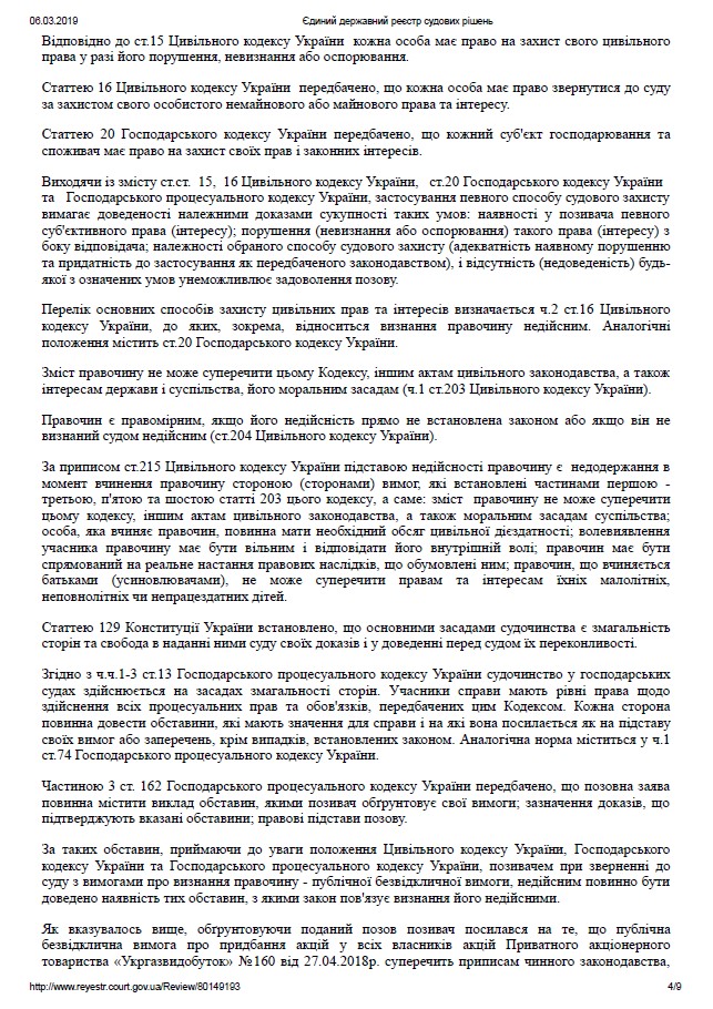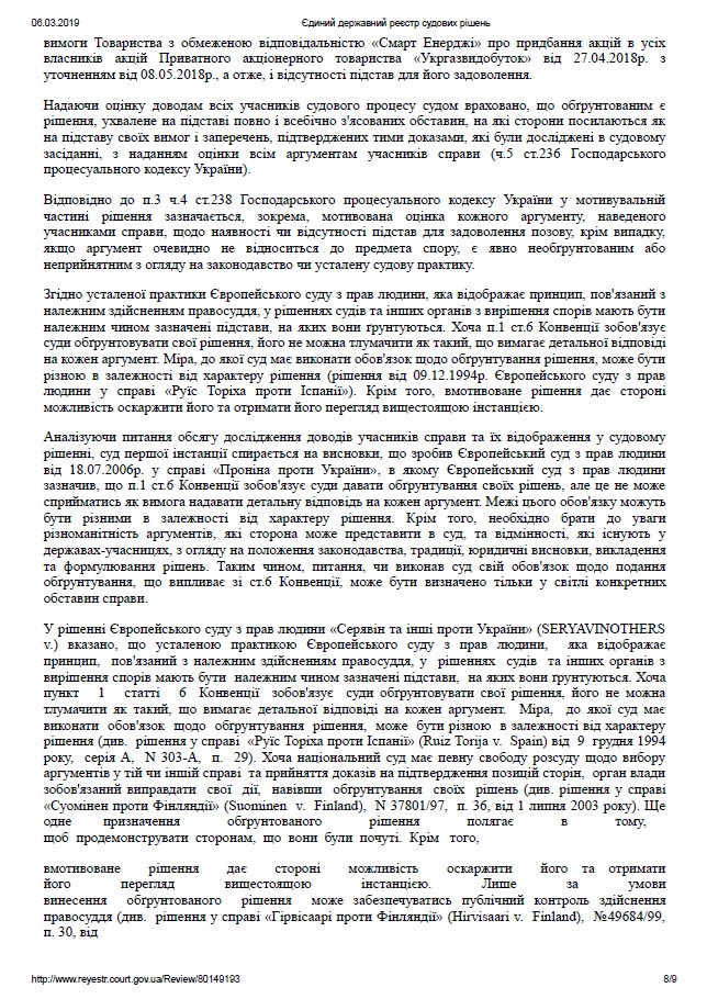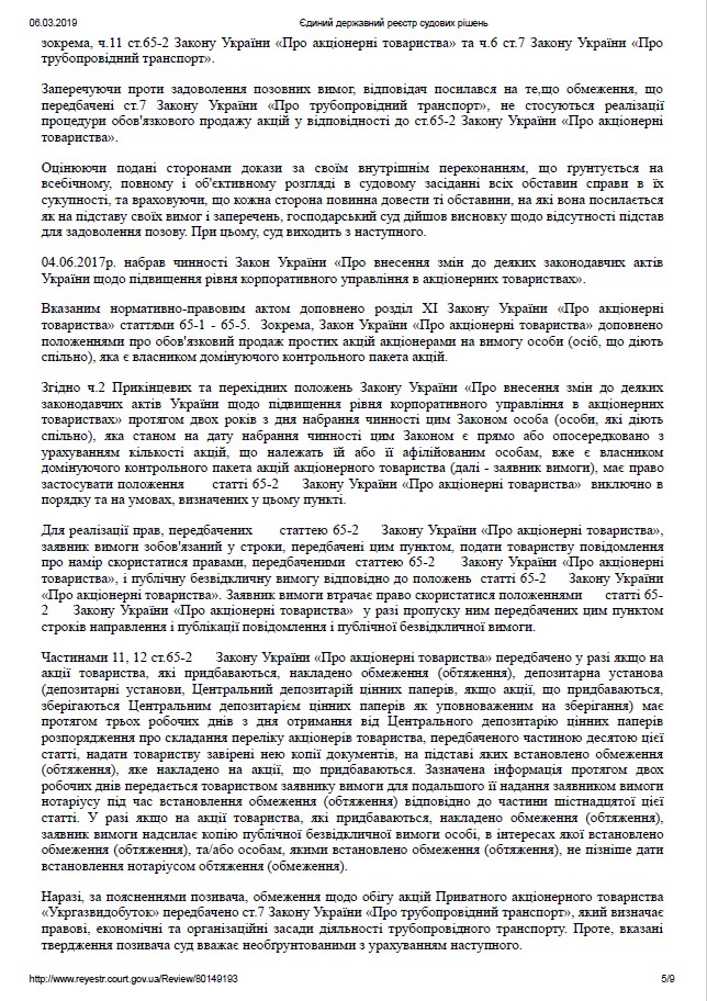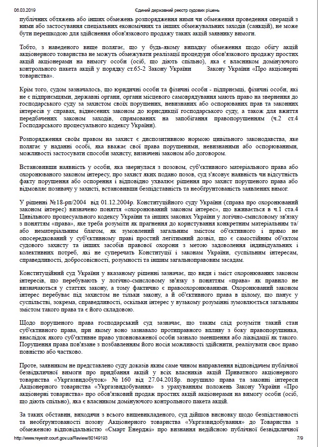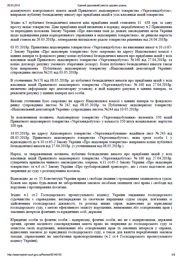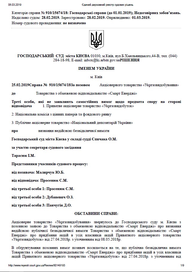 Истец требовал признать неправомерным публичное безотзывное требование «Смарт Энерджи» о приобретении акций всех владельцев акций «Укргазвыдобуток» от 27.04.2018р. с уточнением от 08.05.2018р, что нарушает законные права истца на владение 350 акциями ЧАО «Укргазвыдобуток» номинальной стоимостью 100,00 грн.