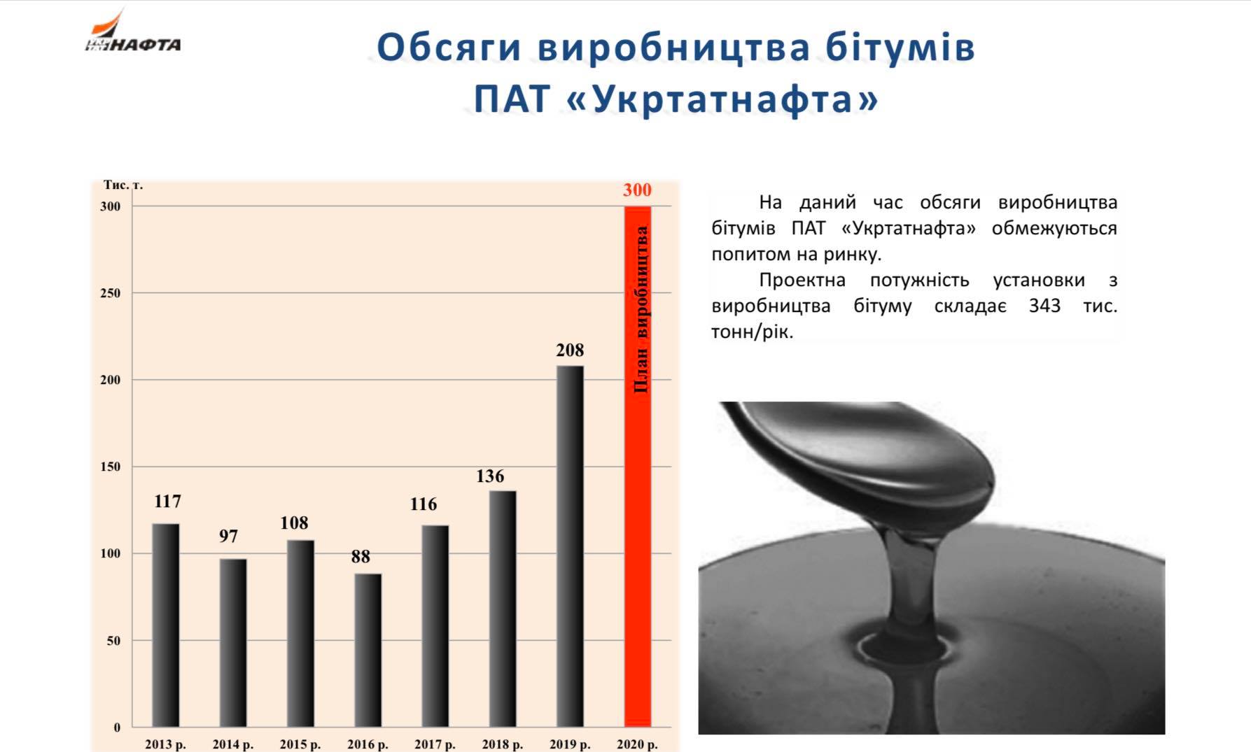 ПАО «Укртатнафта» планирует увеличить производство битума на 44%, до 300 тыс. т. Об этом сообщил главный технолог Кременчугского НПЗ Юрий Голич в рамках доклада на BITUM FORUM 2020.