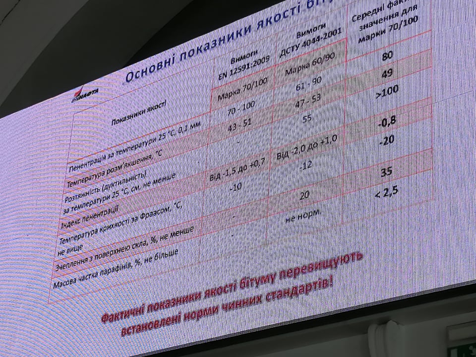 Он подчеркнул, что фактические показатели качества битумов превышают установленные нормы действующих стандартов. Было отмечено, что компания инвестировала 650 тыс. грн в покупку дополнительного оборудования для паспортизации битумов по стандарту EN 12591: 2017.