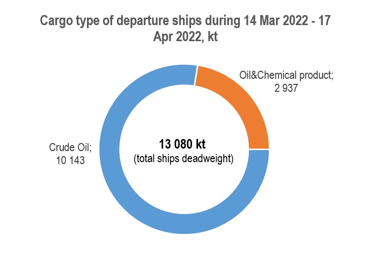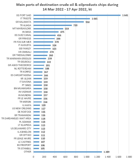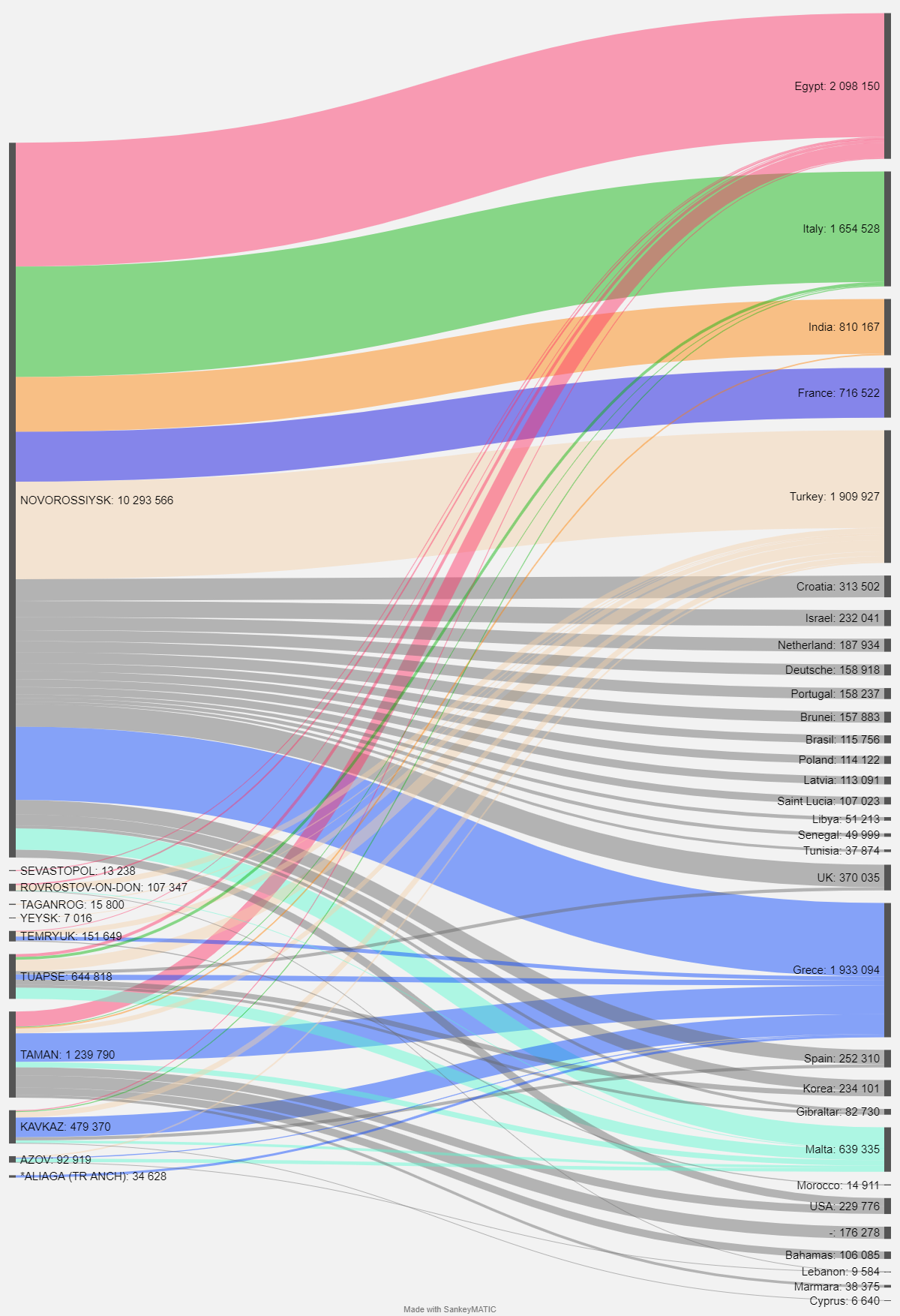 Сумарно за цей період здійснено більше двох сотен рейсів загальний дедвейт цих вантажних суден становив 13,08 млн т. З них 10,1 млн т становлять танкери з нафтою, інше – нафтопродукти та нафтохімія. Найбільші поставки враховуючи обсяги танкерів за період були адресовані Єгипту – сумарний дедвейт танкерів що зайшов в порти країни становить 2,1 млн т (96,8% – нафтові танкери). Водночас до портів Греції та Турції здійснювали заходи кораблі сумарний дедвейт котрих становить – по 1,9 млн т. На відміну від Єгипту до цих країн заходили танкери як з нафтою, так і нафтопродуктами у значній кількості. Також, в Італію були адресовані танкери загальним показником 1,6 млн т, Індію – 0,8 млн т, Францію – 0,7 млн т.