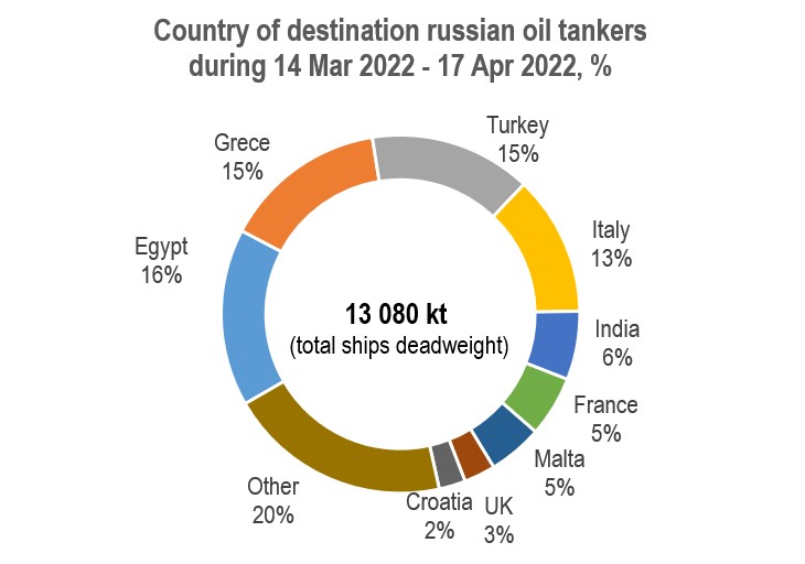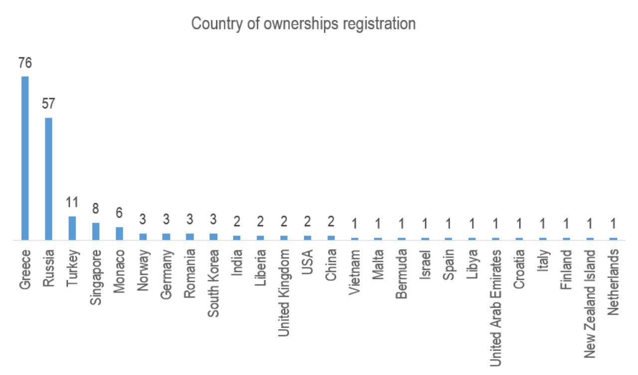 За даними галузевого порталу BlackSeaNews, який надав НафтоРинку інформацію про вихід танкерів з портів Чорного та Азовского морів, протягом 14 березня – 17 квітня 2022 р. рейси здійснювали 192 судна, 76 з яких належать власникам зареєстрованим в Греції, 57 – російським, 11 – турецьким бізнесменам.