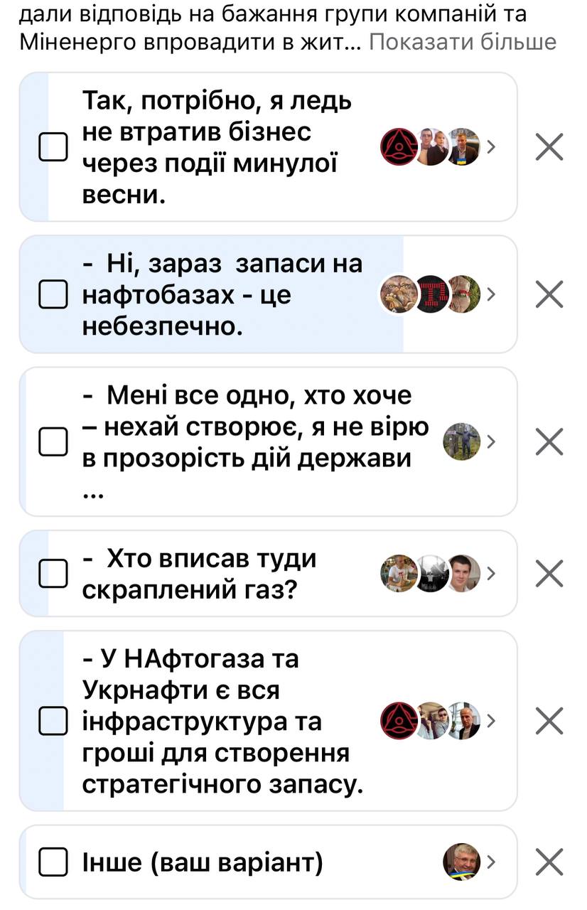 76% респондентів дали негативну відповідь на питання: «Чи потрібно зараз, під час війни виконувати директиви ЄС про створення мінімальних запасів нафти та нафтопродуктів (МЗНН)?», нагадаємо, відповідну ініціативу, щодо створення МЗНН та створення системи репортингу нафтопродуктів озвучив голова Комітету ВРУ з питань фінансів, податкової та митної політики Данило Гетманцев.