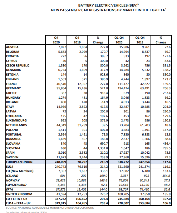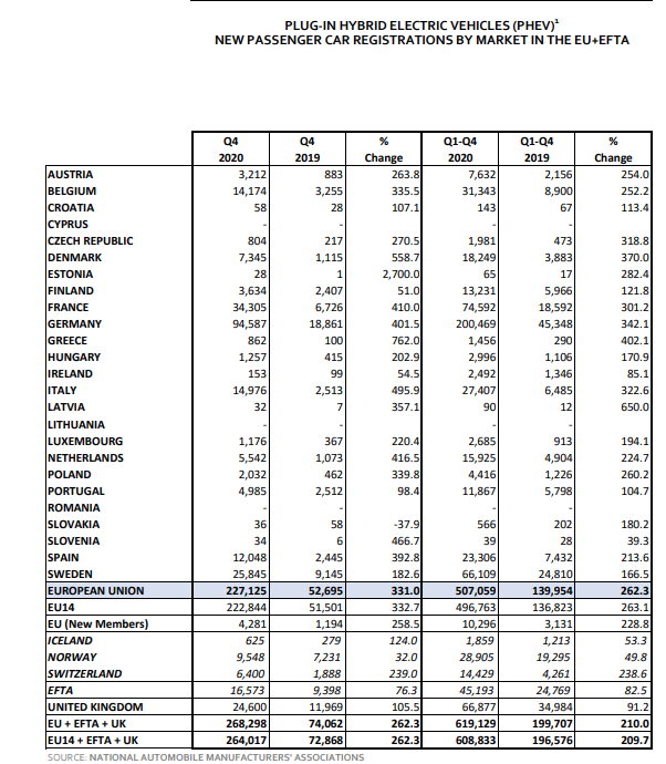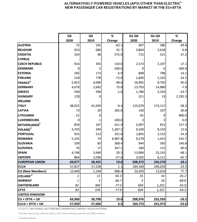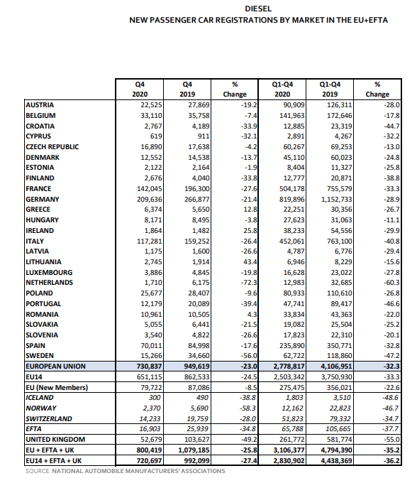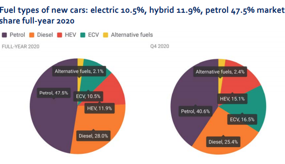 Согласно данным Европейской ассоциации производителей авто в 2020 году продажи новых легковых машин в Европе по типу топлива распределились следующим образом (в скобках цифры за 2019 год для сравнения):