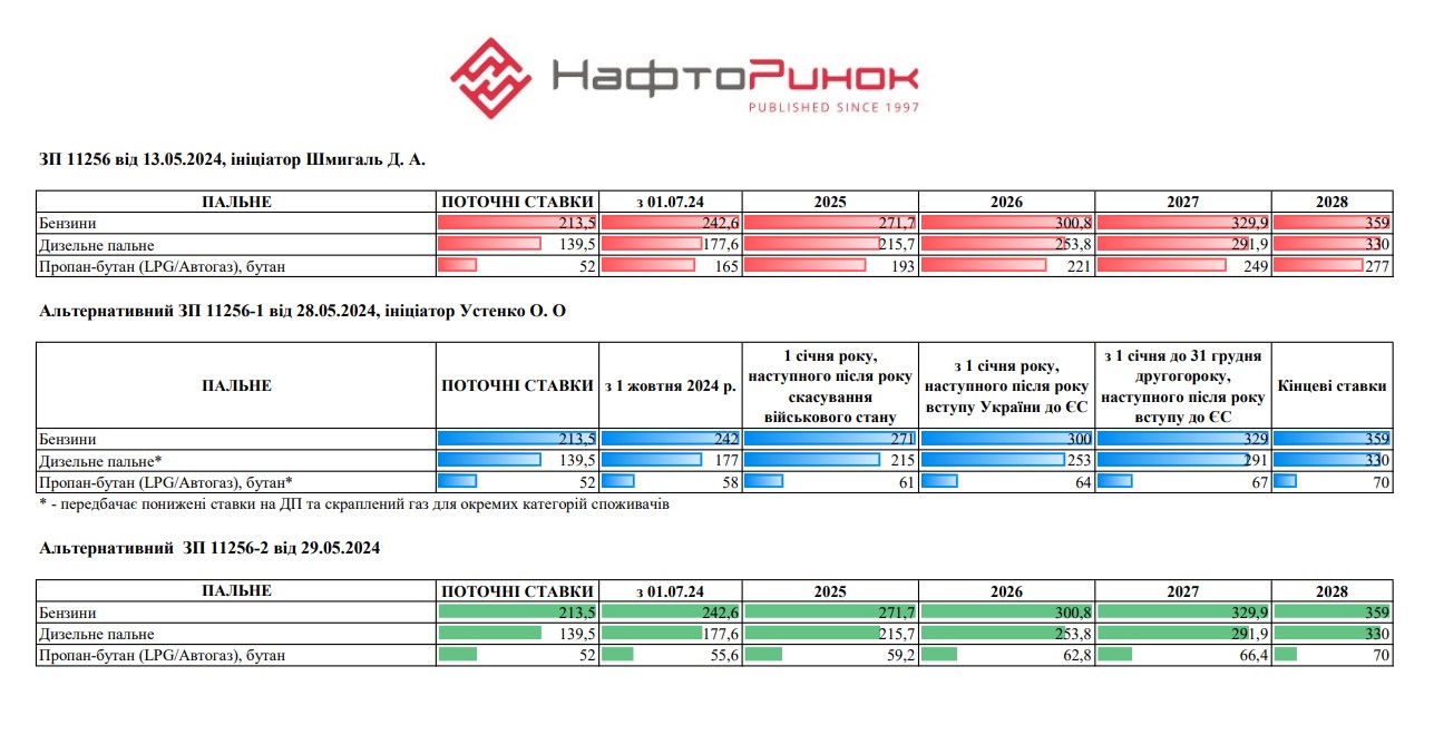 Новим законопроектом пропонується поетапне – до 2028 року, підвищення ставок акцизного податку на пальне відповідно до мінімального рекомендованого рівня директивою 2003/96/ЄС: