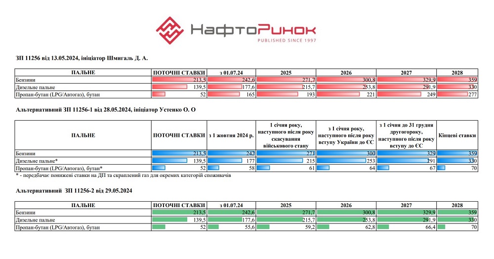 ЗП 11256-2 пропонується поетапне – до 2028 року, підвищення ставок акцизного податку на пальне відповідно до мінімального рекомендованого рівня директивою 2003/96/ЄС: