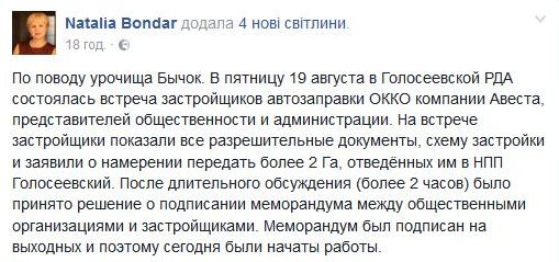 В свою очередь, глава Голосеевской РГА Наталья Бондар в Facebook подтвердила, что на этом месте запланировано стоительство АЗС ОККО.