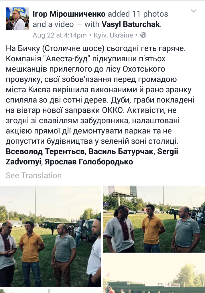 На место происшествия прибыли активисты, депутаты Киеврады от фракции «Свобода», представители добровольческих батальонов «Донбасс» и «Айдар», а также народный депутат Украины от фракции «Самопомощь» Семен Семенченко. Участники отмечали, что стройку охраняло несколько десятков людей спортивного телосложения.