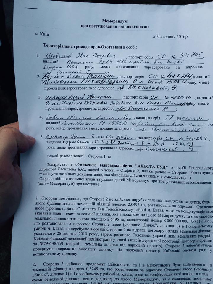 В свою очередь, согласно информации СМИ, 28 октября 2010 года Киевсовет и ООО «Авеста-Буд» заключили договор аренды земельного участка размером 2,65 га, денежная оценка которой составила 8,44 млн грн. Договор заключен на 10 лет. Участок был выделен фирме для строительства офисных комплексов с гостиницами, заведениями общественного питания, помещениями торгово-развлекательного назначения и паркингами, салонов по продаже автомобилей и их технического обслуживания с созданием и благоустройством парков отдыха, скверов, детских площадок.