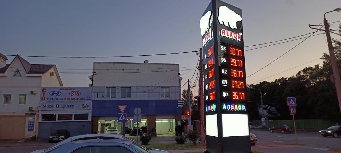 Одесский оператор ALKOR установил новую стелу на АЗС в Малиновском районе Одессы (ул. Космонавта Комарова, 3). Учитывая расположение станции (расположена на пересечении двух улиц), ранее работало два ценовых табло, причем в разном исполнении.