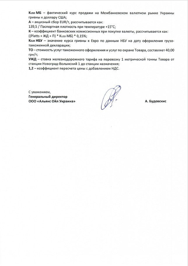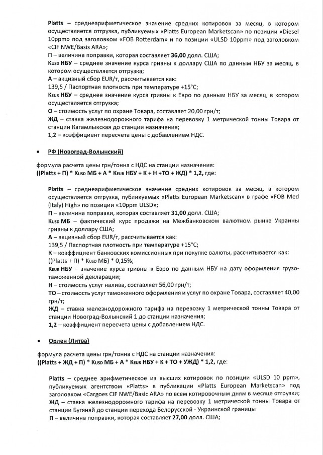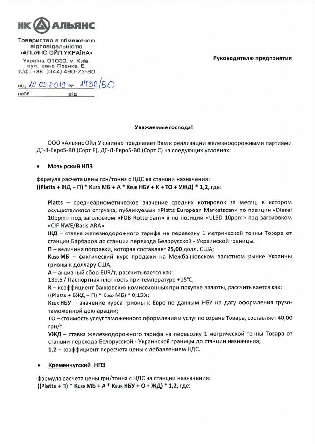 По формульным договорам предлагается дизельное топливо Мозырского, Новополоцкого, Кременчугского НПЗ и «Роснефти», с отгрузкой в железнодорожный транспорт за гривну. Контракты подписываются на срок от одного месяца и до конца 2019 года. Цена рассчитывается до станции назначения покупателя.