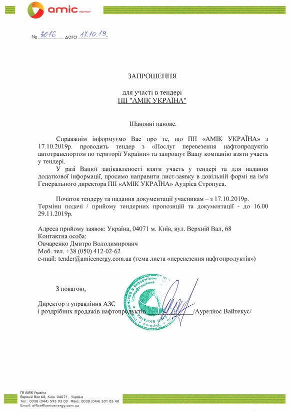 ПИИ «АМИК УКРАИНА» проводит тендер на предмет оказания «Услуг перевозки нефтепродуктов автотранспортом по территории Украины».