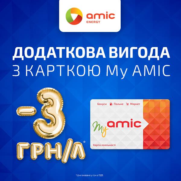 Для присоединения к программе лояльности клиент должен заправится на 10 л и приобрести карту MyAmic за 1 коп., или за 15 грн без заправки.