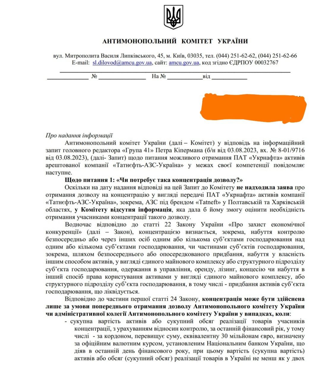 Антимонопольний комітет (АМКУ) поки не отримав від «Укрнафти» запиту про дозвіл на концентрацію активів «Татнєфть-АЗС-Україна». Про це йдеться у відповіді АМКУ на запит головного редактора «Групи 41».