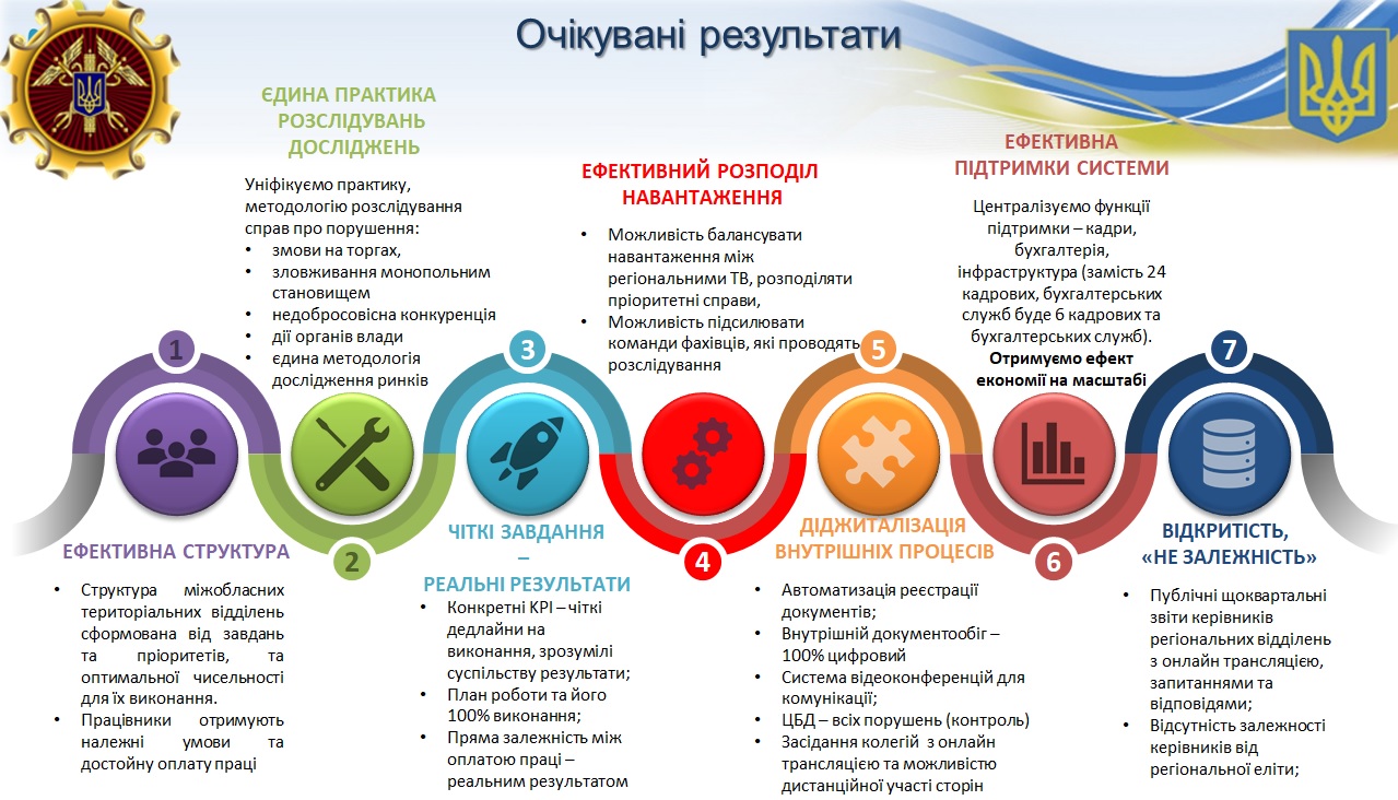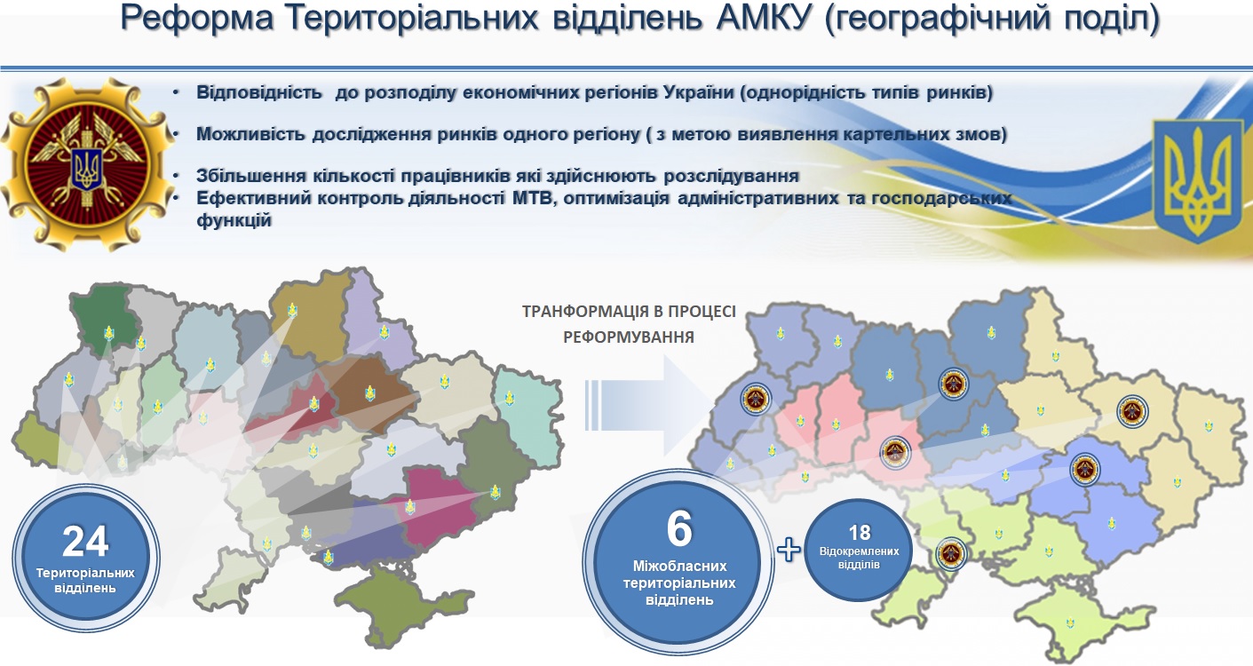 На практике нынешний этап реформы будет предусматривать сокращение территориальных отделений до 6 межрегиональных - Северного, Северо-Восточного, Приднепровского, Причерноморского, Подольского и Западного. В Киеве, Харькове, Днепре, Одессе, Виннице и Львове будут работать новые и эффективные региональные отделения Комитета. В то же время в других областных центрах будут организованы отдельные отделы без статуса юридического лица.