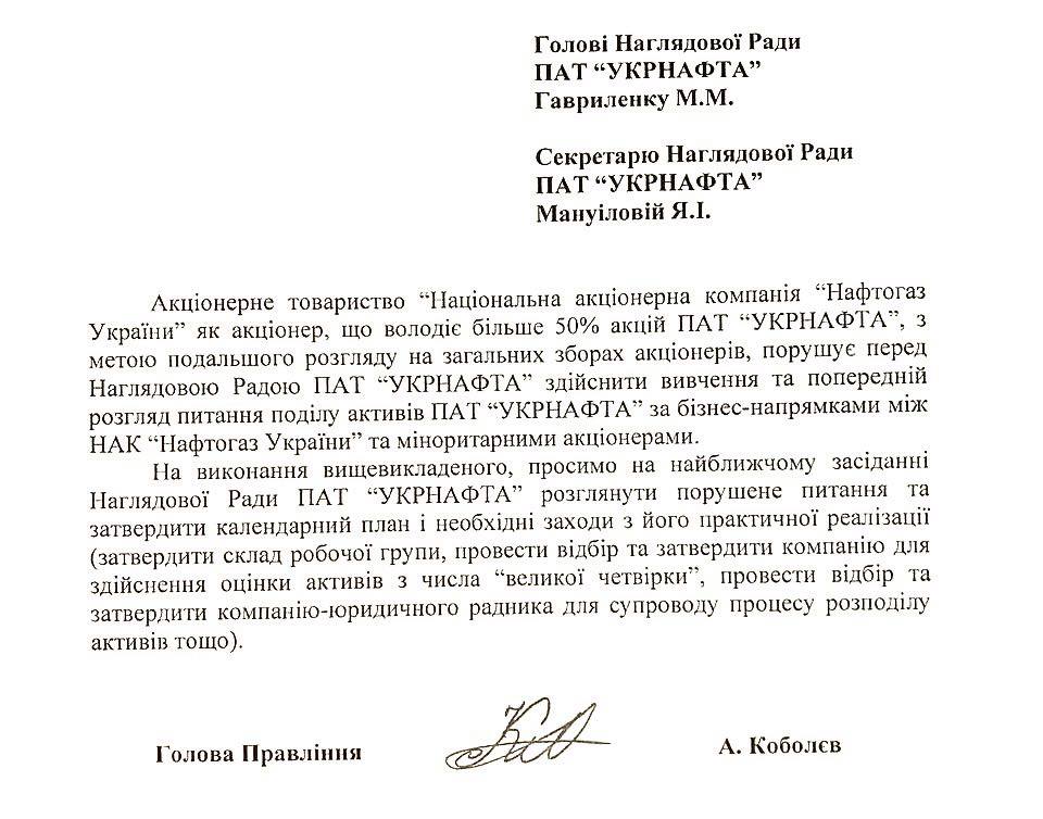 Глава правления НАК «Нафтогаз Украины» Андрей Коболев предложил изучить возможность разделения активов ПАО «Укрнафта». Это следует из письма на имя главы Набсовета «Укрнафты» Гавриленко М.М.