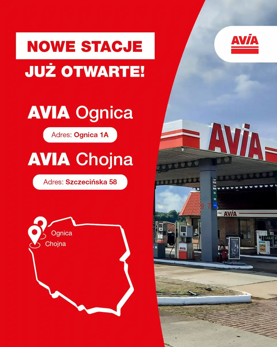 Мережа автозаправних станцій AVIA розширила свою присутність у Польщі, відкривши дві нові станції у містах Хойна та Огніца після завершення процесу ребрендингу, зазначається у повідомленні. Обидві станції вже працюють у фірмових біло-червоних кольорах бренду.