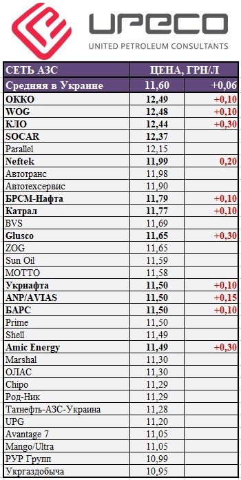 На станциях OKKO и WOG в Киеве газ подорожал на 10 коп./л, до 12,49 грн/л. На KLO цена выросла на 30 коп./л, до 12,44 грн/л, также на Glusco – до 11,65 грн/л. Цена газа на станциях UKRNAFTA, ANP, AVIAS в Киеве выросла до 11,50 грн/л.