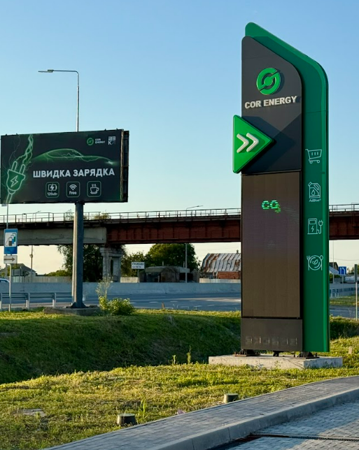 У селі Калинівка Броварського району Київської області на автомагістралі Київ-Чернігів розпочав роботу перший в Україні енергоефективний автозаправний комплекс нового покоління – COR-Energy. На відкритті комплексу презентували енергоефективний комплекс, що дає можливість заряджати електроавтомобілі енергією виробленою виключно сонцем, про це повідомили представники компанії COR-Energy під час відкриття.