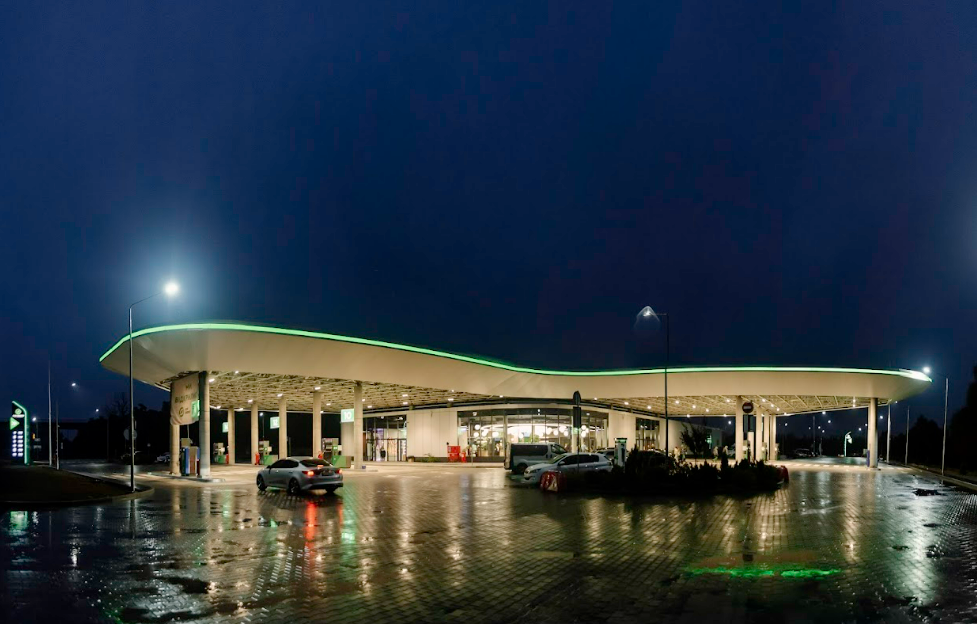 На АЗК COR-Energy за індивідуальною розробкою створена гібридна сонячна станція, яка змонтована у вигляді навісу з 432 сонячних панелей загальною потужністю 180 кВт та ємністю до 500 кВт-год.