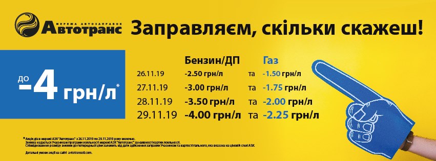 Согласно сообщения компании, с 26 ноября по 29 ноября клиенты- участники программы лояльности, получаю скидки на топливо. Отметим, что 26 ноября скидка составляла 2,5 грн/л на бензины и ДТ, и 1,5 грн/л на газ. При этом каждый последующий день оператор увеличивает размер скидки на 50 коп./л (25 коп./л для газа) – до максимальных 4 грн/л и 2,25 грн/л в «Черную пятницу».