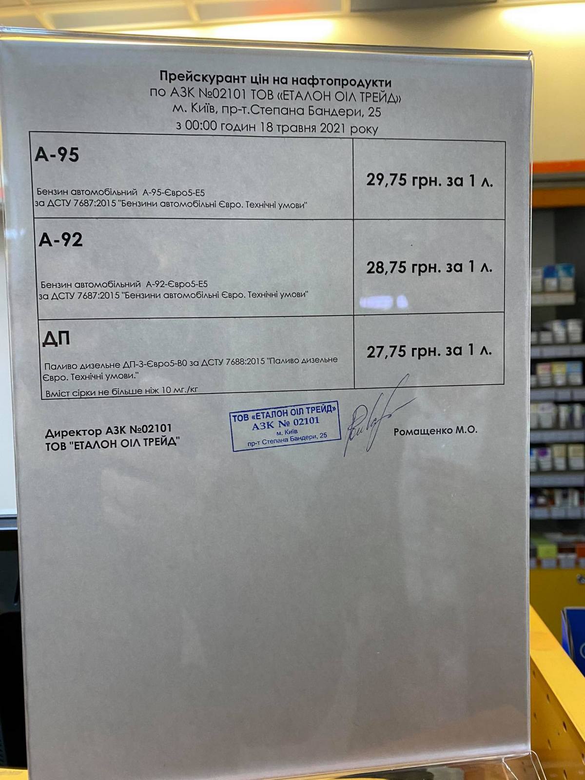 ООО «Эталон Оил Трейд» имеет две лицензии на реализацию топлива и табачных изделий по адресу АЗС GLUSCO с 09.03.2021 г. К продаже предлагается бензин А-95 (29,75 грн/л), А-92 (28,75 грн/л), ДТ (27,75 грн/л), кроме того, на станции сообщили, что работает программа лояльности Glusco Club. В магазине – минимальный набор товаров. По словам Светланы Киреевой, «Эталон Оил Трейд» арендует станцию и начала работать с конца мая.