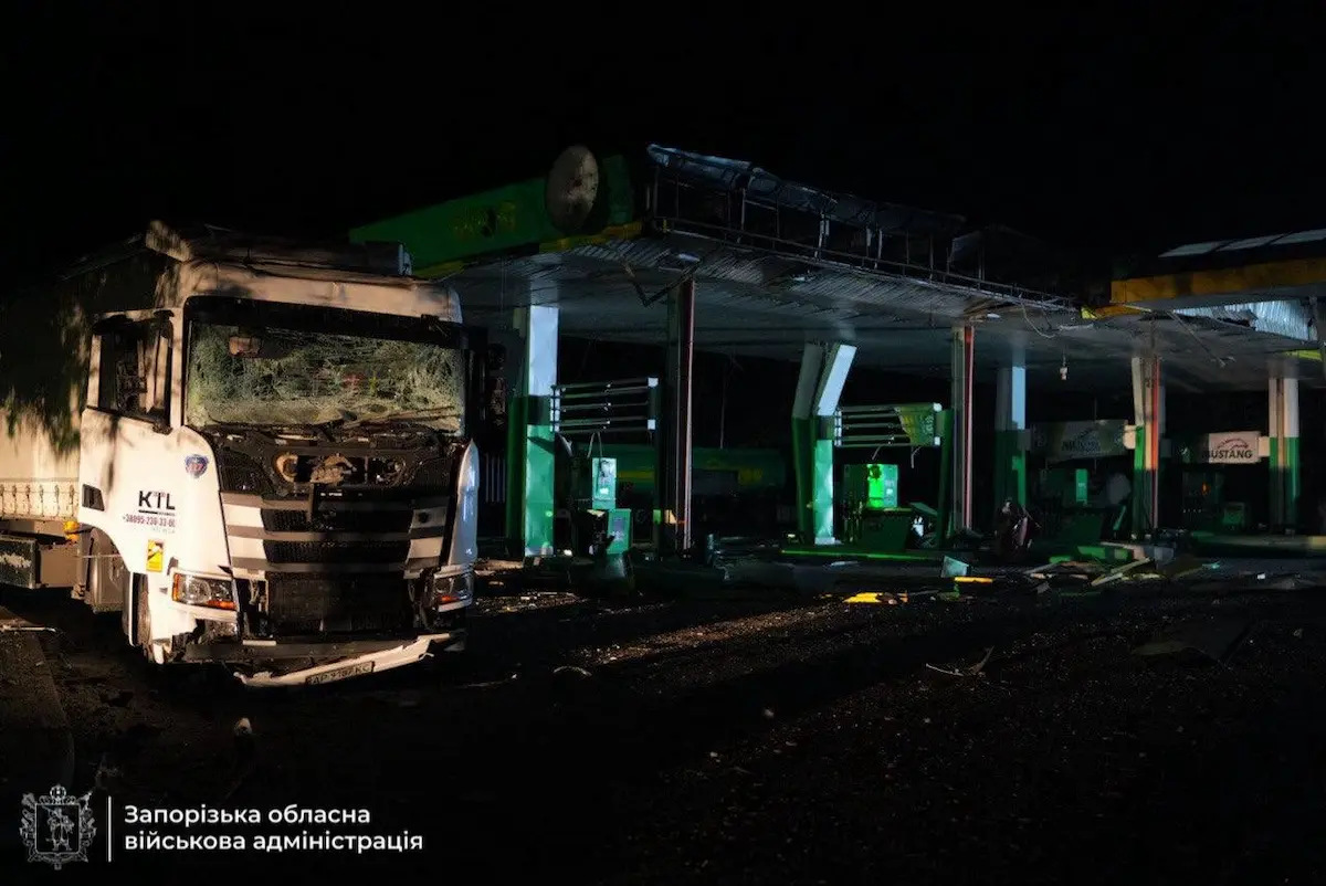 В Запоріжжі було пошкоджено 41 багатоквартирний будинок, 22 приватних будинки та нежитлові будівлі, зокрема заправну станцію. На оприлюднених знімках видно, що йдеться про заправку WOG.
