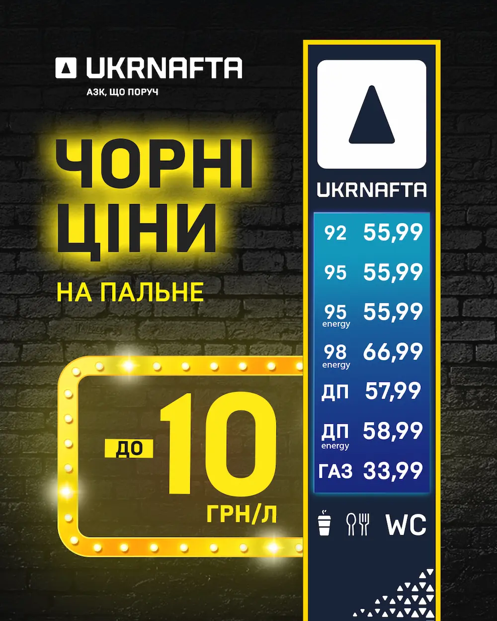 Найбільша мережа України встановила єдину ціну 55,99 грн/л на бензини А-92, А-95 і А-95 Premium, що дає миттєву економію до 7 грн/л. На дизпальне діє знижка 1–3 грн/л, на автогаз – 0,80 грн/л.