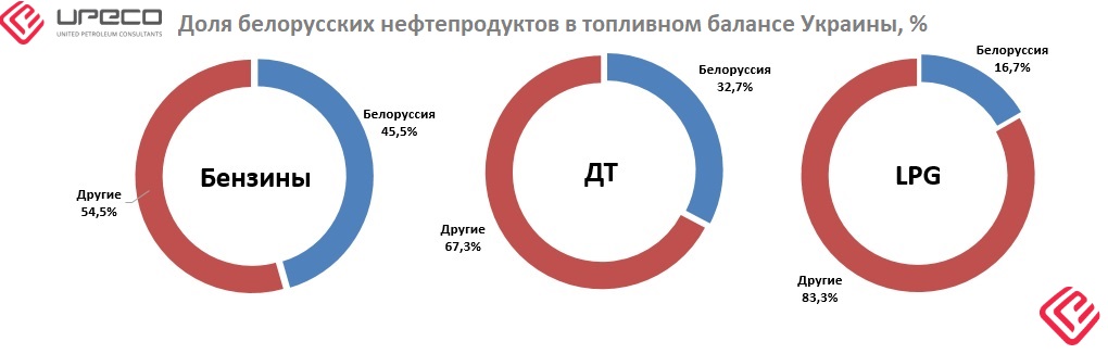 По данным, консалтинговой компании UPECO, на поставки с белорусских НПЗ приходится 3,2 млн т моторных топлив: бензин - 0,8 млн т, ДТ - 2,1 млн т, газ автомобильный - 0,3 млн т. Её доля составляет около 32% баланса рынка моторных топлив Украины. В частности, на украинском рынке бензинов Беларусь занимает более 50%.