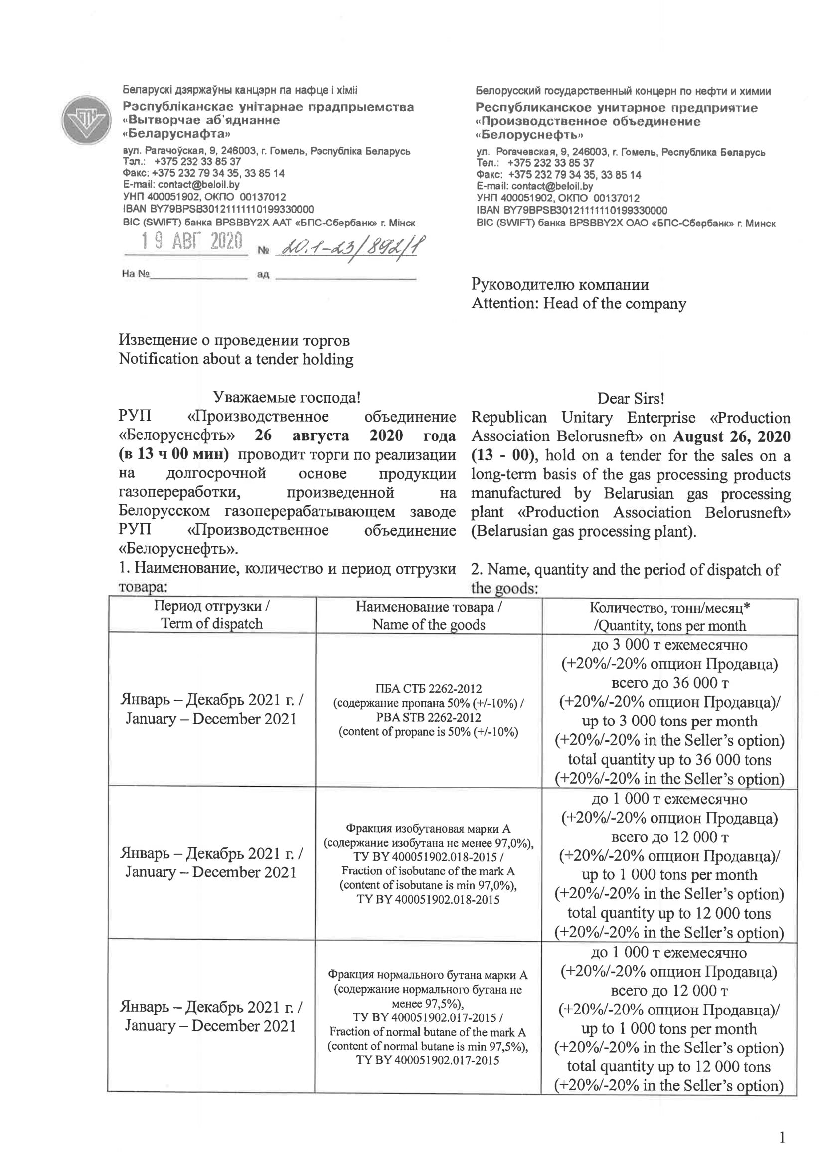 19 августа 2020 г. РУП «ПО «Белоруснефть» оповестила участников рынка о проведении 26 августа 2020 г. торгов по реализации сжиженного газа производства Речицкого ГПЗ на долгосрочной основе в 2021 году.