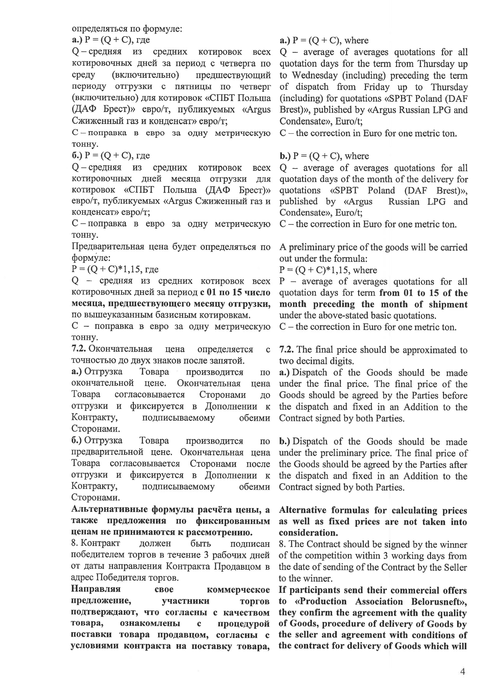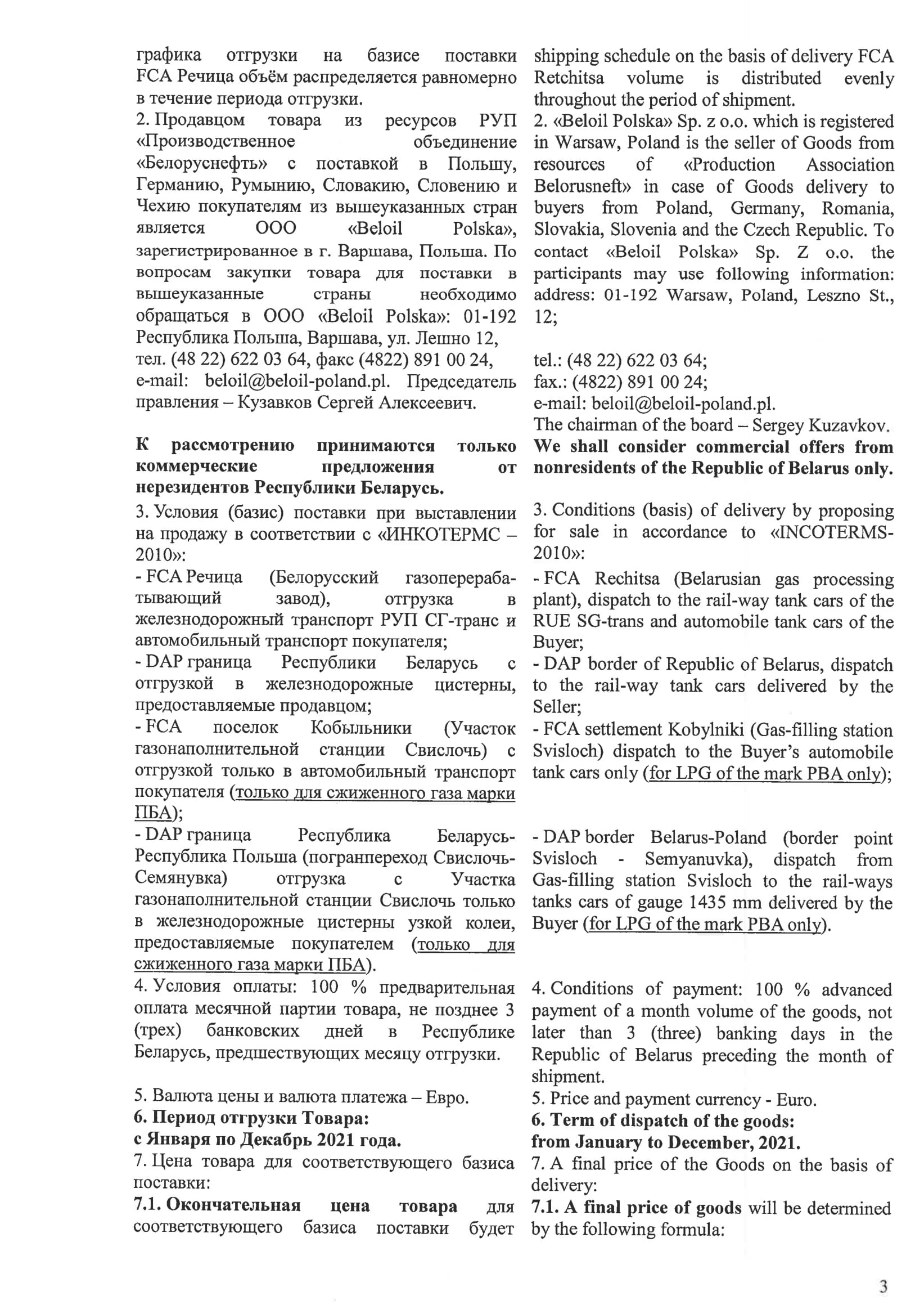 Сроки отргузки: январь-декабрь 2021 г. Конечная стоимость будет формироваться с учетом поправки и средней средних цен за месяц отгрузки на пропан-бутан по базису DAF Brest публикуемых ценовым агентством Argus.